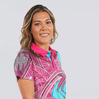 A striking new polo design painted by resident artist Charlie Chambers Jnr. Our model is wearing a size 8 polo.