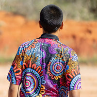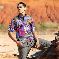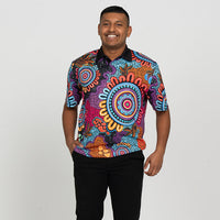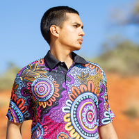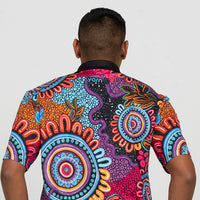 "This design represents people from all nations coming together to celebrate our beautiful cultures. With all our Elders surrounded watching the next generation grow with strong identities while they practice culture, dance, language, art and story telling." -Alkina