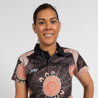 Look great and stay sun safe with our fitted polo shirt crafted from recycled polyester. Our polos deliver a comfortable, stylish look that can be worn anywhere, a true wardrobe essential. This women’s polo shirt features ‘Meeting at the River’, a gorgeous artwork by Barkindji Woman Caitlyn Davies-Plummer.