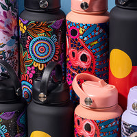 Our beautiful insulated stainless steel handled bottles are perfect for staying hydrated during your day-to-day activities. The double-walled vacuum design is printed with fabulous First Nations artwork that keeps your drinks cold for 24 hours and hot for 12 hours.