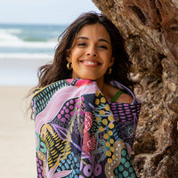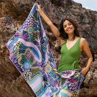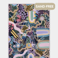 Elevate your next beach trip with our luxurious sand-free beach towels, showcasing stunning artwork by First Nations collaborating artists. Each towel features a beautiful, sublimated design that tells a unique story of the artist's deep connection to Country.