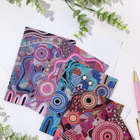 There are 5 cards in each pack with unique artworks that celebrate Country and culture. Each card is blank inside so you can write your messages however you want to and comes with a plain white envelope ready to send to your loved ones.