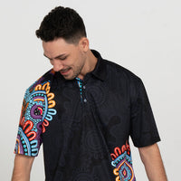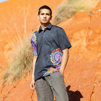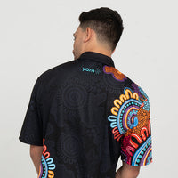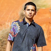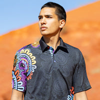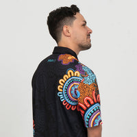 "This design represents people from all nations coming together to celebrate our beautiful cultures. With all our Elders surrounded watching the next generation grow with strong identities while they practice culture, dance, language, art and story telling." -Alkina