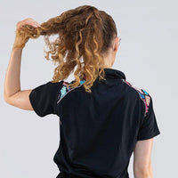 Featuring a classic soft collar, two-button placket and embroidered chest logo, this slim fitting top works great with a black skirt or work pants.