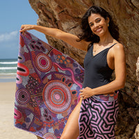 Elevate your next beach trip with our luxurious sand-free beach towels, showcasing stunning artwork by First Nations collaborating artists. Each towel features a beautiful, sublimated design that tells a unique story of the artist's deep connection to Country.